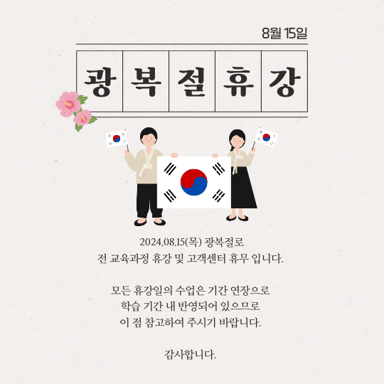 | 다음글 ▲ | 추석 연휴 휴강 안내 | 관리자 | 2024-09-09 | 4285 |