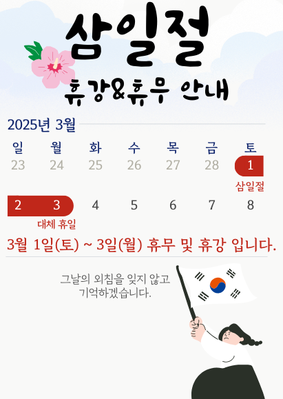 | 첨부파일 : FILE 삼일절 휴무 안내 공지_6666296101.png |